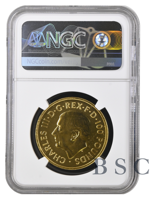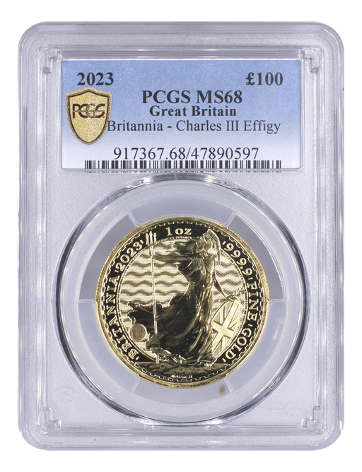 Charles III Effigy, 2023 1oz Gold Britannia One Hundred Pounds PCGS MS68