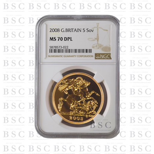Royal MintCall us: 0800 107 51352008 £5 Quintuple Sovereign St George Proof Gold Coin. Graded PF70 Ultra Cameo by NGC. NGC Certification Number: 6768528-014 Exact coin pictured....