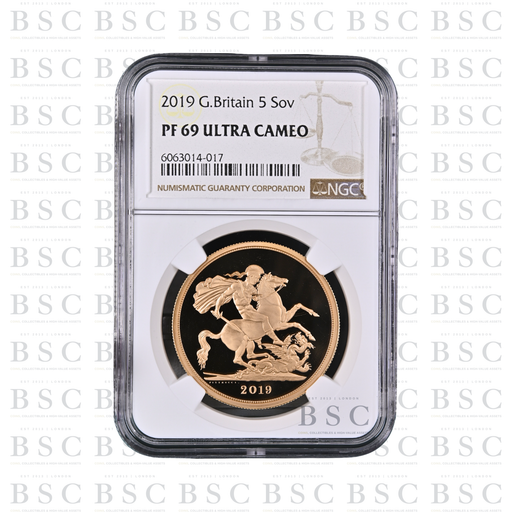 Royal MintCall us: 0800 107 51352019 £5 Quintuple Sovereign St George Proof Gold Coin. Graded PF69 Ultra Cameo by NGC. NGC Certification Number: 6063014-017 Exact coin pictured....