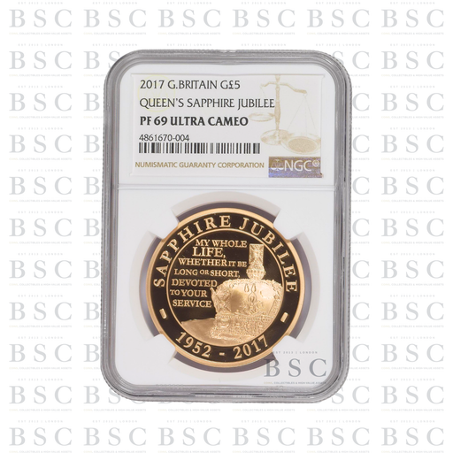 Royal MintCall us: 0800 107 51352017 £5 Queen’s Sapphire Jubilee Proof Gold Coin. Graded PF69 Ultra Cameo by NGC. NGC Certification Number: 4861670-004 Exact coin pictured. Supp...