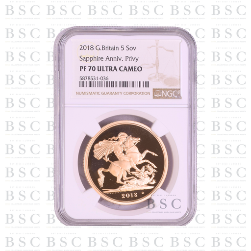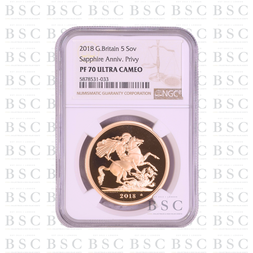 Royal MintCall us: 0800 107 51352018 £5 Quintuple Sovereign St George Sapphire Privy Proof Gold Coin. Graded PF70 Ultra Cameo by NGC. NGC Certification Number: 5878531-035 Exact...
