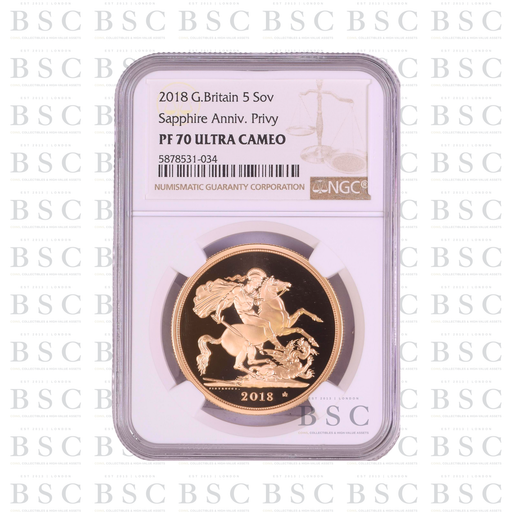 Royal MintCall us: 0800 107 51352018 £5 Quintuple Sovereign St George Sapphire Privy Proof Gold Coin. Graded PF70 Ultra Cameo by NGC. NGC Certification Number: 5878531-034 Exact...