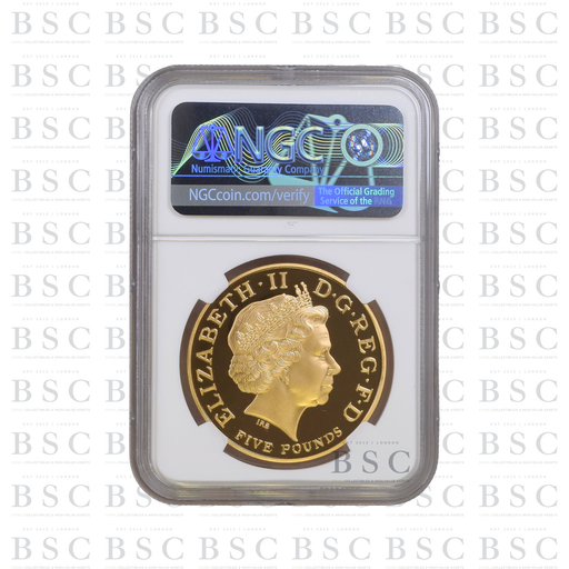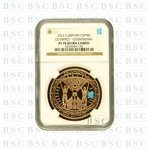 Royal MintCall us: 0800 107 51352012 £5 Quintuple Sovereign Olympics Countdown Proof Gold Coin. Graded PF70 Ultra Cameo by NGC. NGC Certification Number: 3624349-126 Exact coin ...