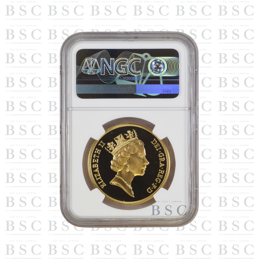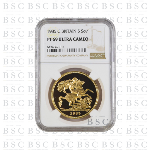 Royal MintCall us: 0800 107 51351985 £5 Quintuple Sovereign St George Proof Gold Coin. Graded PF69 Ultra Cameo by NGC. NGC Certification Number: 6134067-011 Exact coin pictured....